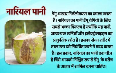 डेंगू अक्सर निर्जलीकरण का कारण बनता है। नारियल का पानी डेंगू रोगियों के लिए सबसे अच्छा विकल्प है क्योंकि यह पानी, आवश्यक खनिजों और इलेक्ट्रोलाइट्स का प्राकृतिक स्रोत है। इसका सेवन शरीर में तरल स्तर को नियंत्रित करने में मदद करता है। इस प्रकार, नारियल का पानी एक चीज है जिसे आपको निश्चित रूप से डेंगू के मरीज के आहार में शामिल करना चाहिए।