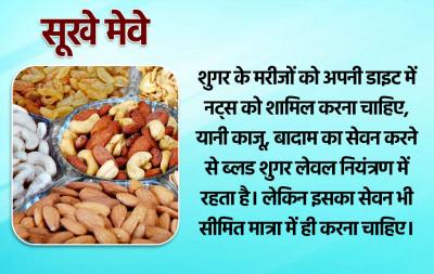 शुगर के मरीजों को अपनी डाइट में नट्स को शामिल करना चाहिए, यानी काजू, बादाम का सेवन करने से ब्लड शुगर लेवल नियंत्रण में रहता है। लेकिन इसका सेवन भी सीमित मात्रा में ही करना चाहिए।