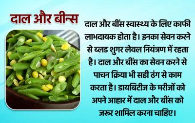 दाल और बींस स्वास्थ्य के लिए काफी लाभदायक होता है। इनका सेवन करने से ब्लड शुगर लेवल नियंत्रण में रहता है। दाल और बींस का सेवन करने से पाचन क्रिया भी सही ढंग से काम करता है। डायबिटीज के मरीजों को अपने आहार में दाल और बींस को जरूर शामिल करना चाहिए।
