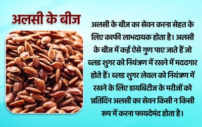 अलसी के बीज का सेवन करना सेहत के लिए काफी लाभदायक होता है। अलसी के बीज में कई ऐसे गुण पाए जाते हैं जो ब्लड शुगर को नियंत्रण में रखने में मददगार होते हैं। ब्लड शुगर लेवल को नियंत्रण में रखने के लिए डायबिटीज के मरीजों को प्रतिदिन अलसी का सेवन किसी न किसी रूप में करना फायदेमंद होता है।