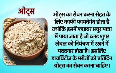 ओट्स का सेवन करना सेहत के लिए काफी फायदेमंद होता है क्योंकि इसमें फाइबर प्रचुर मात्रा में पाया जाता है जो ब्लड शुगर लेवल को नियंत्रण में रखने में मददगार होता है। इसलिए डायबिटीज के मरीजों को प्रतिदिन ओट्स का सेवन करना चाहिए।