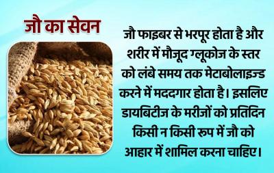 जौ फाइबर से भरपूर होता है और शरीर में मौजूद ग्लूकोज के स्तर को लंबे समय तक मेटाबोलाइज्ड करने में मददगार होता है। इसलिए डायबिटीज के मरीजों को प्रतिदिन किसी न किसी रूप में जौ को आहार में शामिल करना चाहिए।