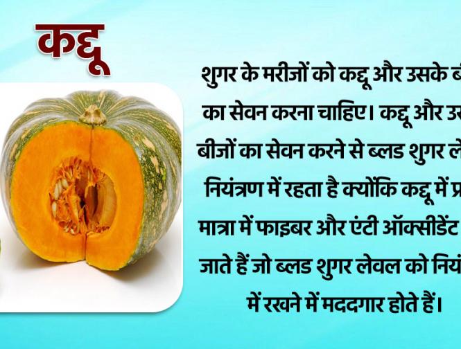 शुगर के मरीजों को कद्दू और उसके बीजों का सेवन करना चाहिए। कद्दू और उसके बीजों का सेवन करने से ब्लड शुगर लेवल नियंत्रण में रहता है क्योंकि कद्दू में प्रचुर मात्रा में फाइबर और एंटी ऑक्सीडेंट पाए जाते हैं जो ब्लड शुगर लेवल को नियंत्रण में रखने में मददगार होते हैं।