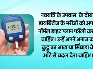 1 / 6नवरात्रि के उपवास के दौरान डायबिटीज के मरीजों को अपना नॉर्मल डाइट प्लान फॉलो करना चाहिए। उन्हें अपने अनाज को कुट्टू का आटा या सिंघाड़ा के आटे से बदल देना चाहिए। 2 / 6नवरात्रि उपवास के दौरान प्रोटीन स्रोत के लिए केवल दूध और पनीर का इस्तेमाल करें। 3 / 6डायबिटीज के मरीज जौ का भी इस्तेमाल कर सकते हैं। ये डायबिटीज के मरीजों के लिए बेहतर चीज है। 4 / 6इन दिनों सिंघाड़ा आटे का अधिक इस्तेमाल किया जाता है जिसमें सभी पोषक तत्व होते हैं। इसमें कम ग्लाइसेमिक इंडेक्स है और इस प्रकार नवरात्रि उपवास के दौरान डायबिटीज मरीजों के लिए बेहतर है।5 / 6नवरात्रि उपवास में आलू भी शामिल है। लेकिन आपको आलू खाने से बचना चाहिए। इसके बजाय वो दही के साथ रोटी खा सकते हैं और अपने खाने में सलाद शामिल कर सकते हैं। 6 / 6आपको कुट्टू या सिंघाड़ा आटे की रोटी ही खानी चाहिए। इसके अलावा पूरी या पकौड़ी जैसी ऑयली चीजों से बचना चाहिए।