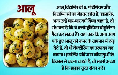 आलू विटामिन बी 6, पोटेशियम और विटामिन सी का बेहतर स्रोत हैं, हालांकि, अगर उन्हें बार-बार गर्म किया जाता है, तो संभावना है कि वे क्लोस्ट्रीडियम बोटुलिनम पैदा कर सकते हैं। यहां तक कि अगर आप पके हुए आलू को कमरे के तापमान में छोड़ देते हैं, तो भी बैक्टीरिया का उत्पादन बढ़ जाएगा। इसलिए यदि आप जीवाणुओं के विकास से बचना चाहते हैं, तो सबसे अच्छा है कि इसका तुरंत सेवन करें।