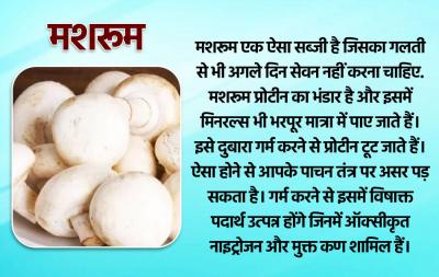 मशरूम एक ऐसा सब्जी है जिसका गलती से भी अगले दिन सेवन नहीं करना चाहिए. मशरूम प्रोटीन का भंडार है और इसमें मिनरल्स भी भरपूर मात्रा में पाए जाते हैं। इसे दुबारा गर्म करने से प्रोटीन टूट जाते हैं। ऐसा होने से आपके पाचन तंत्र पर असर पड़ सकता है। गर्म करने से इसमें विषाक्त पदार्थ उत्पन्न होंगे जिनमें ऑक्सीकृत नाइट्रोजन और मुक्त कण शामिल हैं।