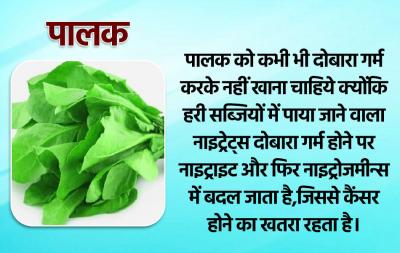 पालक को कभी भी दोबारा गर्म करके नहीं खाना चाहिये क्योंकि हरी सब्जियों में पाया जाने वाला नाइट्रेट्स दोबारा गर्म होने पर नाइट्राइट और फिर नाइट्रोजमीन्स में बदल जाता है,जिससे कैंसर होने का खतरा रहता है।