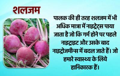 पालक की ही तरह शलजम में भी अधिक मात्रा में नाइट्रेट्स पाया जाता है जो कि गर्म होने पर पहले नाइट्राइट और उसके बाद नाइट्रोजमीन्स में बदल जाते हैं। जो हमारे स्वास्थ्य के लिये हानिकारक हैं।