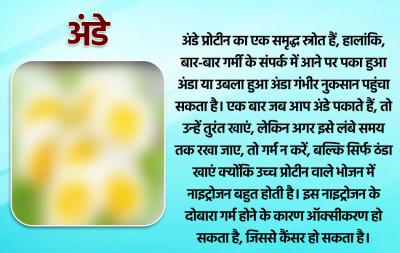 अंडे प्रोटीन का एक समृद्ध स्रोत हैं, हालांकि, बार-बार गर्मी के संपर्क में आने पर पका हुआ अंडा या उबला हुआ अंडा गंभीर नुकसान पहुंचा सकता है। एक बार जब आप अंडे पकाते हैं, तो उन्हें तुरंत खाएं, लेकिन अगर इसे लंबे समय तक रखा जाए, तो गर्म न करें, बल्कि सिर्फ ठंडा खाएं क्योंकि उच्च प्रोटीन वाले भोजन में नाइट्रोजन बहुत होती है। इस नाइट्रोजन के दोबारा गर्म होने के कारण ऑक्सीकरण हो सकता है, जिससे कैंसर हो सकता है।