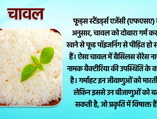 फूड्स स्टैंडर्ड्स एजेंसी (एफएसए) के अनुसार, चावल को दोबारा गर्म करके खाने से फूड पॉइजनिंग से पीड़ित हो सकते हैं। ऐसा चावल में बैसिलस सेरेस नामक नामक बैक्टीरिया की उपस्थिति के कारण है। गर्माहट इन जीवाणुओं को मारती है, लेकिन इससे उन बीजाणुओं को बढ़ा सकती है, जो प्रकृति में विषाक्त हैं।