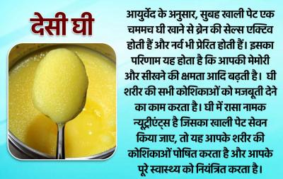 आयुर्वेद के अनुसार, सुबह खाली पेट एक चममच घी खाने से ब्रेन की सेल्स एक्टिव होती हैं और नर्व भी प्रेरित होती हैं। इसका परिणाम यह होता है कि आपकी मेमोरी और सीखने की क्षमता आदि बढ़ती है।