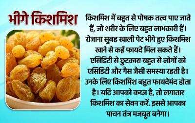 किशमिश में बहुत से पोषक तत्व पाए जाते हैं, जो शरीर के लिए बहुत लाभकारी हैं। रोजाना सुबह खाली पेट भीगे हुए किशमिश खाने से कई फायदे मिल सकते हैं। एसिडिटी से छुटकारा बहुत से लोगों को एसिडिटी और गैस जैसी समस्या रहती है। उनके लिए किशमिश बहुत फायदेमंद होता है। यदि आपको कब्ज है, तो लगातार किशमिश का सेवन करें. इससे आपका पाचन तंत्र मजबूत बनेगा।