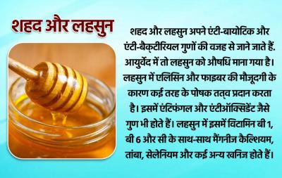 शहद और लहसुन अपने एंटी-बायोटिक और एंटी-बैक्टीरियल गुणों की वजह से जाने जाते हैं. आयुर्वेद में तो लहसुन को औषधि माना गया है। लहसुन में एलिसिन और फाइबर की मौजूदगी के कारण कई तरह के पोषक तत्व प्रदान करता है।
