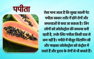 ऐसा माना जाता है कि सुबह खाली पेट पपीता खाकर शरीर में होने रोगों और समस्याओं से बचा जा सकता है। जिन लोगों को कोलेस्ट्रोल की समस्या बनी रहती है, उनके लिए पपीता किसी दवा से कम नहीं है। पपीते में मौजूद विटामिन सी और फाइबर कोलेस्ट्रोल को कंट्रोल में रखते हैं और हृदय के रोगों से भी बचाते हैं।
