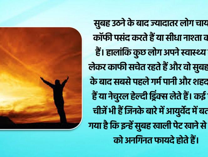 सुबह उठने के बाद ज्यादातर लोग चाय या कॉफी पसंद करते हैं या सीधा नाश्ता करते हैं। हालांकि कुछ लोग अपने स्वास्थ्य को लेकर काफी सचेत रहते हैं और वो सुबह उठने के बाद सबसे पहले गर्म पानी और शहद लेते हैं या नेचुरल हेल्दी ड्रिंक्स लेते हैं। कई ऐसी चीजें भी हैं जिनके बारे में आयुर्वेद में बताया गया है कि इन्हें सुबह खाली पेट खाने से सेहत को अनगिनत फायदे होते हैं।