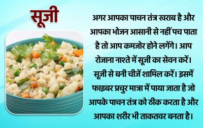 अगर आपका पाचन तंत्र खराब है और आपका भोजन आसानी से नहीं पच पाता है तो आप कमजोर होने लगेंगे। आप रोजाना नाश्ते में सूजी का सेवन करें। सूजी से बनी चीजें शामिल करें। इसमें फाइबर प्रचुर मात्रा में पाया जाता है जो आपके पाचन तंत्र को ठीक करता है और आपका शरीर भी ताकतवर बनता है।