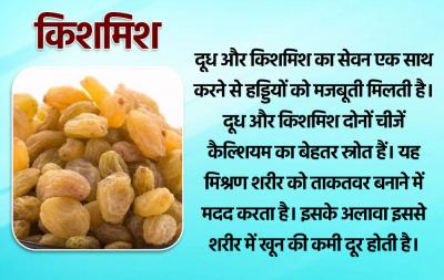 दूध और किशमिश का सेवन एक साथ करने से हड्डियों को मजबूती मिलती है। दूध और किशमिश दोनों चीजें कैल्शियम का बेहतर स्रोत हैं। यह मिश्रण शरीर को ताकतवर बनाने में मदद करता है। इसके अलावा इससे शरीर में खून की कमी दूर होती है।