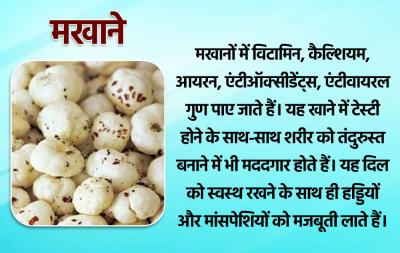 मखानों में विटामिन, कैल्शियम, आयरन, एंटीऑक्सीडेंट्स, एंटीवायरल गुण पाए जाते हैं। यह खाने में टेस्टी होने के साथ-साथ शरीर को तंदुरुस्त बनाने में भी मददगार होते हैं। यह दिल को स्वस्थ रखने के साथ ही हड्डियों और मांसपेशियों को मजबूती लाते हैं।