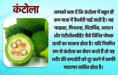 आपको बता दें कि कंटोला में बहुत ही कम मात्रा में कैलोरी पाई जाती है। यह फाइबर, मिनरल्स, विटामिंस, आयरन और एंटीऑक्सीडेंट जैसे विभिन्न पोषक तत्वों का खजाना होता है। यदि नियमित रूप से कंटोला का सेवन करते हैं तो यह शरीर की कमजोरी को दूर करने में काफी मददगार साबित होता है।