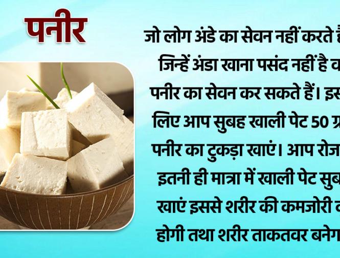 जो लोग अंडे का सेवन नहीं करते हैं या जिन्हें अंडा खाना पसंद नहीं है वह पनीर का सेवन कर सकते हैं। इसके लिए आप सुबह खाली पेट 50 ग्राम पनीर का टुकड़ा खाएं। आप रोजाना इतनी ही मात्रा में खाली पेट सुबह खाएं इससे शरीर की कमजोरी दूर होगी तथा शरीर ताकतवर बनेगा।