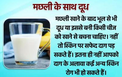 मछली खाने के बाद भूल से भी दूध या इससे बनी किसी चीज को खाने से बचना चाहिए। नहीं तो स्किन पर सफेद दाग पड़ सकते हैं। इतना ही नहीं आपको दाग के अलावा कई अन्य स्किन रोग भी हो सकते हैं।