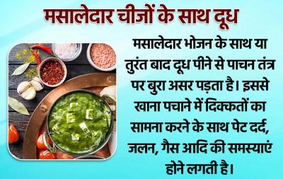 मसालेदार भोजन के साथ या तुरंत बाद दूध पीने से पाचन तंत्र पर बुरा असर पड़ता है। इससे खाना पचाने में दिक्कतों का सामना करने के साथ पेट दर्द, जलन, गैस आदि की समस्याएं होने लगती है।