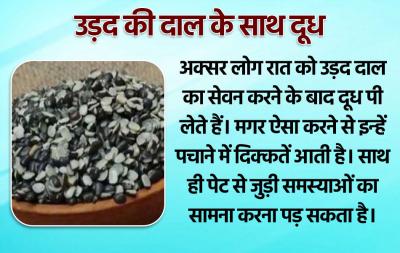 अक्सर लोग रात को उड़द दाल का सेवन करने के बाद दूध पी लेते हैं। मगर ऐसा करने से इन्हें पचाने में दिक्कतें आती है। साथ ही पेट से जुड़ी समस्याओं का सामना करना पड़ सकता है।