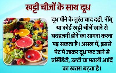 दूध पीने के तुरंत बाद दही, नींबू या कोई खट्टी चीजें खाने से बदहजमी होने का सामना करना पड़ सकता है। असल में, इससे पेट में जाकर दूध फट जाने से एसिडिटी, उल्टी या मतली आदि का खतरा बढ़ता है।