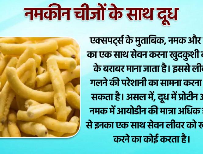 एक्सपर्ट्स के मुताबिक, नमक और दूध का एक साथ सेवन करना खुदकुशी करने के बराबर माना जाता है। इससे लीवर गलने की परेशानी का सामना करना पड़ सकता है। असल में, दूध में प्रोटीन और नमक में आयोडीन की मात्रा अधिक होने से इनका एक साथ सेवन लीवर को खराब करने का कोई करता है।
