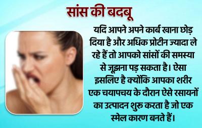 यदि आपने अपने कार्ब खाना छोड़ दिया है और अधिक प्रोटीन ज्यादा ले रहे हैं तो आपको सांसों की समस्या से जूझना पड़ सकता है। ऐसा इसलिए है क्योंकि आपका शरीर एक चयापचय के दौरान ऐसे रसायनों का उत्पादन शुरू करता है जो एक स्मेल कारण बनते हैं।