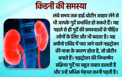 लंबे समय तक हाई-प्रोटीन आहार लेने से भी आपके गुर्दे प्रभावित हो सकते हैं। यह पहले से ही गुर्दे की समस्याओं से पीड़ित लोगों के लिए और भी बदतर है। यह अमीनो एसिड में पाए जाने वाले नाइट्रोजन की मात्रा के कारण होता है, जो प्रोटीन बनाते हैं। नाइट्रोजन की निष्कर्षण प्रक्रिया गुर्दे पर बहुत दबाव डालती है और उन्हें अधिक मेहनत करनी पड़ती है।