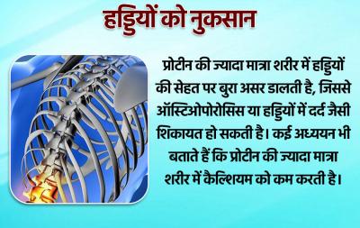 प्रोटीन की ज्यादा मात्रा शरीर में हड्डियों की सेहत पर बुरा असर डालती है, जिससे ऑस्टिओपोरोसिस या हड्डियों में दर्द जैसी शिकायत हो सकती है। कई अध्ययन भी बताते हैं कि प्रोटीन की ज्यादा मात्रा शरीर में कैल्शियम को कम करती है।
