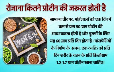 सामान्य तौर पर, महिलाओं को एक दिन में कम से कम 50 ग्राम प्रोटीन की आवश्यकता होती है और पुरुषों के लिए यह 60 ग्राम प्रति दिन होता है। मांसपेशियों के निर्माण के समय, एक व्यक्ति को प्रति दिन शरीर के वजन के प्रति किलोग्राम 1.2-1.7 ग्राम प्रोटीन खाना चाहिए।