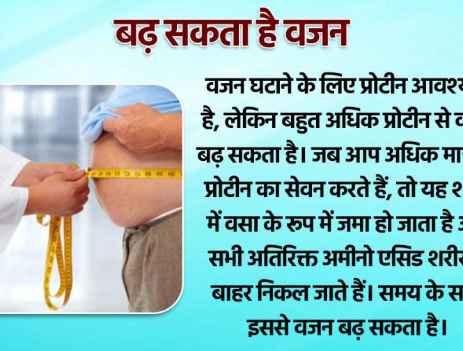 वजन घटाने के लिए प्रोटीन आवश्यक है, लेकिन बहुत अधिक प्रोटीन से वजन बढ़ सकता है। जब आप अधिक मात्रा में प्रोटीन का सेवन करते हैं, तो यह शरीर में वसा के रूप में जमा हो जाता है और सभी अतिरिक्त अमीनो एसिड शरीर से बाहर निकल जाते हैं। समय के साथ इससे वजन बढ़ सकता है।