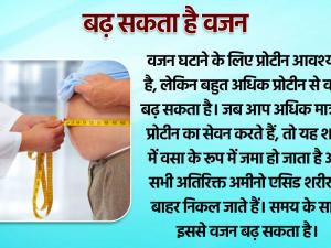 1 / 7वजन घटाने के लिए प्रोटीन आवश्यक है, लेकिन बहुत अधिक प्रोटीन से वजन बढ़ सकता है। जब आप अधिक मात्रा में प्रोटीन का सेवन करते हैं, तो यह शरीर में वसा के रूप में जमा हो जाता है और सभी अतिरिक्त अमीनो एसिड शरीर से बाहर निकल जाते हैं। समय के साथ इससे वजन बढ़ सकता है। 2 / 7कार्ब का कम सेवन करना और प्रोटीन की मात्रा बढ़ाना भी आपको हर समय कब्ज महसूस करवा सकता है। कार्ब्स मूल रूप से फाइबर से मिलते हैं और फाइबर मल को सरल बनाते हैं। अधिक मात्रा पानी पीना और फाइबर का सेवन बढ़ाने से इस समस्या से बचा जा सकता है।3 / 7यदि आपने अपने कार्ब खाना छोड़ दिया है और अधिक प्रोटीन ज्यादा ले रहे हैं तो आपको सांसों की समस्या से जूझना पड़ सकता है। ऐसा इसलिए है क्योंकि आपका शरीर एक चयापचय के दौरान ऐसे रसायनों का उत्पादन शुरू करता है जो एक स्मेल कारण बनते हैं। 4 / 7पशु-आधारित प्रोटीन के सबसे अच्छे स्रोत हैं। आपको पता होना चाहिए कि मांस और डेयरी जैसे प्रोटीन के पशु-आधारित स्रोतों में भी अधिक मात्रा में वसा होता है, जो हृदय संबंधी विकारों का जन्म दे सकते हैं।5 / 7लंबे समय तक हाई-प्रोटीन आहार लेने से भी आपके गुर्दे प्रभावित हो सकते हैं। यह पहले से ही गुर्दे की समस्याओं से पीड़ित लोगों के लिए और भी बदतर है। यह अमीनो एसिड में पाए जाने वाले नाइट्रोजन की मात्रा के कारण होता है, जो प्रोटीन बनाते हैं। नाइट्रोजन की निष्कर्षण प्रक्रिया गुर्दे पर बहुत दबाव डालती है और उन्हें अधिक मेहनत करनी पड़ती है। 6 / 7प्रोटीन की ज्यादा मात्रा शरीर में हड्डियों की सेहत पर बुरा असर डालती है, जिससे ऑस्टिओपोरोसिस या हड्डियों में दर्द जैसी शिकायत हो सकती है। कई अध्ययन भी बताते हैं कि प्रोटीन की ज्यादा मात्रा शरीर में कैल्शियम को कम करती है।7 / 7सामान्य तौर पर, महिलाओं को एक दिन में कम से कम 50 ग्राम प्रोटीन की आवश्यकता होती है और पुरुषों के लिए यह 60 ग्राम प्रति दिन होता है। मांसपेशियों के निर्माण के समय, एक व्यक्ति को प्रति दिन शरीर के वजन के प्रति किलोग्राम 1.2-1.7 ग्राम प्रोटीन खाना चाहिए।