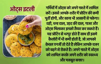 गर्मियों में ओट्स को अपने नाश्ते में शामिल करें। इससे आपके शरीर में प्रोटिन की कमी पूर्ती होगी, और खाना भी आसानी से पकेगा। दही, चना दाल, उड़द की दाल, गाजर और ओट्स मिलाकर इनको तैयार कर सकते हैं। यह प्रोटिन से भरपूर होते हैं साथ ही इसमे कैलोरी में भी कमी होती है, जो आपको केवल एनर्जी तो देते है लेकिन आपके वजन को बढ़ने से रोकते है। अपने नास्ते में ओट्स को शामिल करके अपने शरीर को स्वस्थ्य और मजबूत बनाए।