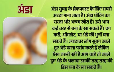 अंडा सुबह के ब्रेकफास्ट के लिए सबसे अच्छा माना जाता है। अंडा प्रोटिन का सस्ता और अच्छा स्रोत है। इसे आप कई तरह से बना के खा सकते हैं। एग करी, ऑमलेट, या अंडे की भुर्जी बना सकते हैं। ज्यादातर लोग सुबग उबले हुए अंडे खाना पसंद करते हैं लेकिन ऐसा जरूरी नहीं है आप चाहे तो उबले हुए अंडे के अलावा उसकी तरह तरह की डिस बना के खा सकते हैं।