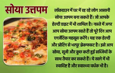 लॉकडाउन में घर में रह रहे लोग आसानी सोया उत्तपम बना सकते हैं। जो आपके हेल्दी डाइट में भी शामिल है। नास्ते में अगर आप सोया उत्तपम खाते हैं तो पूरे दिन आप एनर्जेटिक महसूस करेंगे, यह एक हेल्दी और प्रोटिन से भरपूर ब्रेकफास्ट है।