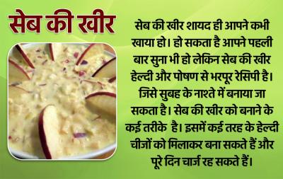 सेब की खीर शायद ही आपने कभी खाया हो। हो सकता है आपने पहली बार सुना भी हो लेकिन सेब की खीर हेल्दी और पोषण से भरपूर रेसिपी है। जिसे सुबह के नाश्ते में बनाया जा सकता है। सेब की खीर को बनाने के कई तरीके है। इसमें कई तरह के हेल्दी चीजों को मिलाकर बना सकते हैं और पूरे दिन चार्ज रह सकते हैं।