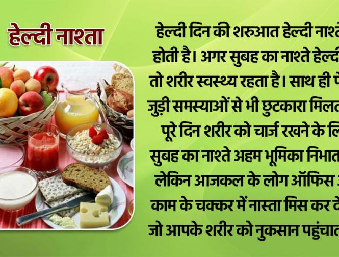 हेल्दी दिन की शरुआत हेल्दी नाश्ते से होती है। अगर सुबह का नाश्ते हेल्दी रहे तो शरीर स्वस्थ्य रहता है। साथ ही पेट से जुड़ी समस्याओं से भी छुटकारा मिलता है। पूरे दिन शरीर को चार्ज रखने के लिए सुबह का नाश्ते अहम भूमिका निभाता है।