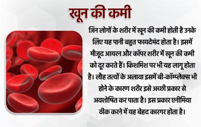 जिन लोगों के शरीर में खून की कमी होती है उनके लिए यह पानी बहुत फायदेमंद होता है। इसमें मौजूद आयरन और कॉपर शरीर में खून की कमी को दूर करते हैं। किशमिश पर भी यह लागू होता है। लौह तत्वों के अलावा इसमें बी-कॉम्प्लेक्स भी होने के कारण शरीर इसे अच्छी प्रकार से अवशोषित कर पाता है। इस प्रकार एनीमिया ठीक करने में यह बेहद कारगर होता है।