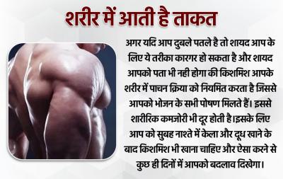 अगर यदि आप दुबले पतले है तो शायद आप के लिए ये तरीका कारगर हो सकता है और शायद आपको पता भी नही होगा की किशमिश आपके शरीर में पाचन क्रिया को नियमित करता है जिससे आपको भोजन के सभी पोषण मिलते हैं। इससे शारीरिक कमजोरी भी दूर होती है।इसके लिए आप को सुबह नाश्ते में केला और दूध खाने के बाद किशमिश भी खाना चाहिए और ऐसा करने से कुछ ही दिनों में आपको बदलाव दिखेगा।