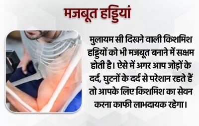 मुलायम सी दिखने वाली किशमिश हड्डियों को भी मजबूत बनाने में सक्षम होती है। ऐसे में अगर आप जोड़ों के दर्द, घुटनों के दर्द से परेशान रहते हैं तो आपके लिए किशमिश का सेवन करना काफी लाभदायक रहेगा।