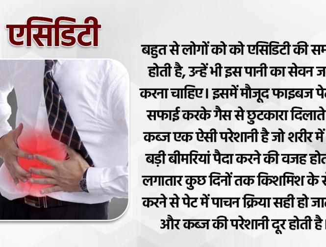 बहुत से लोगों को को एसिडिटी की समस्या होती है, उन्हें भी इस पानी का सेवन जरूर करना चाहिए। इसमें मौजूद फाइबज पेट की सफाई करके गैस से छुटकारा दिलाते हैं। कब्ज एक ऐसी परेशानी है जो शरीर में कई बड़ी बीमरियां पैदा करने की वजह होती है लगातार कुछ दिनों तक किशमिश के सेवन करने से पेट में पाचन क्रिया सही हो जाती है और कब्ज की परेशानी दूर होती है।