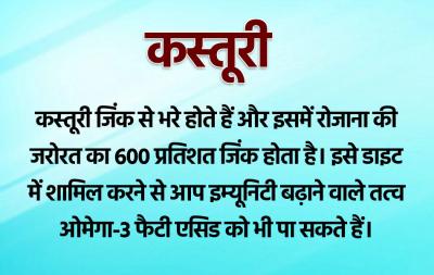 कस्तूरी जिंक से भरे होते हैं और इसमें रोजाना की जरोरत का 600 प्रतिशत जिंक होता है। इसे डाइट में शामिल करने से आप इम्यूनिटी बढ़ाने वाले तत्व ओमेगा-3 फैटी एसिड को भी पा सकते हैं।