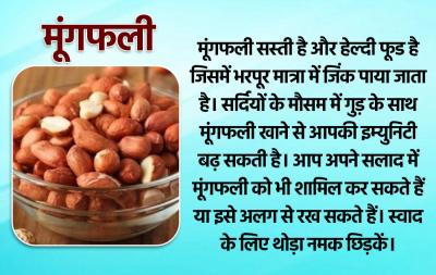 मूंगफली सस्ती है और हेल्दी फूड है जिसमें भरपूर मात्रा में जिंक पाया जाता है। सर्दियों के मौसम में गुड़ के साथ मूंगफली खाने से आपकी इम्युनिटी बढ़ सकती है। आप अपने सलाद में मूंगफली को भी शामिल कर सकते हैं या इसे अलग से रख सकते हैं। स्वाद के लिए थोड़ा नमक छिड़कें।