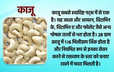 काजू सबसे स्वादिष्ट नट्स में से एक है। यह जस्ता और आयरन, विटामिन के, विटामिन ए और फोलेट जैसे अन्य पोषक तत्वों से भरा होता है। 28 ग्राम काजू में 1।6 मिलीग्राम जिंक होता है और नियमित रूप से इनका सेवन करने से रक्तचाप के स्तर को बनाए रखने में मदद मिलती है।