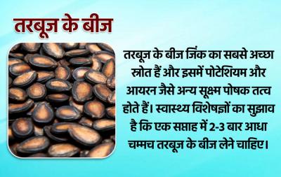 तरबूज के बीज जिंक का सबसे अच्छा स्रोत हैं और इसमें पोटेशियम और आयरन जैसे अन्य सूक्ष्म पोषक तत्व होते हैं। स्वास्थ्य विशेषज्ञों का सुझाव है कि एक सप्ताह में 2-3 बार आधा चम्मच तरबूज के बीज लेने चाहिए।