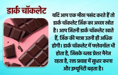 यदि आप एक मीठा पसंद करते हैं तो डार्क चॉकलेट जिंक का अच्छा स्रोत है। आप जितनी डार्क चॉकलेट खाते हैं, जिंक की मात्रा उतनी ही अधिक होगी। डार्क चॉकलेट में फ्लेवनॉल भी होता है, जिसके ब्लड प्रेशर मैनेज रहता है, रक्त प्रवाह में सुधार करना और इम्यूनिटी बढ़ता है।
