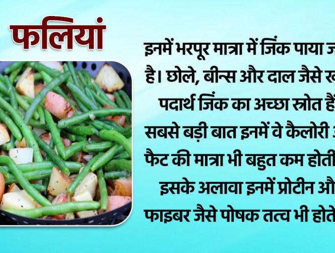 इनमें भरपूर मात्रा में जिंक पाया जाता है। छोले, बीन्स और दाल जैसे खाद्य पदार्थ जिंक का अच्छा स्रोत हैं। सबसे बड़ी बात इनमें वे कैलोरी और फैट की मात्रा भी बहुत कम होती है। इसके अलावा इनमें प्रोटीन और फाइबर जैसे पोषक तत्व भी होते हैं।